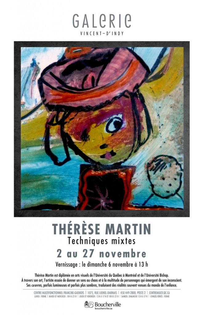 « Thérèse Martin est diplômée en arts visuels de l’Université du Québec à Montréal et de l’Université Bishop.