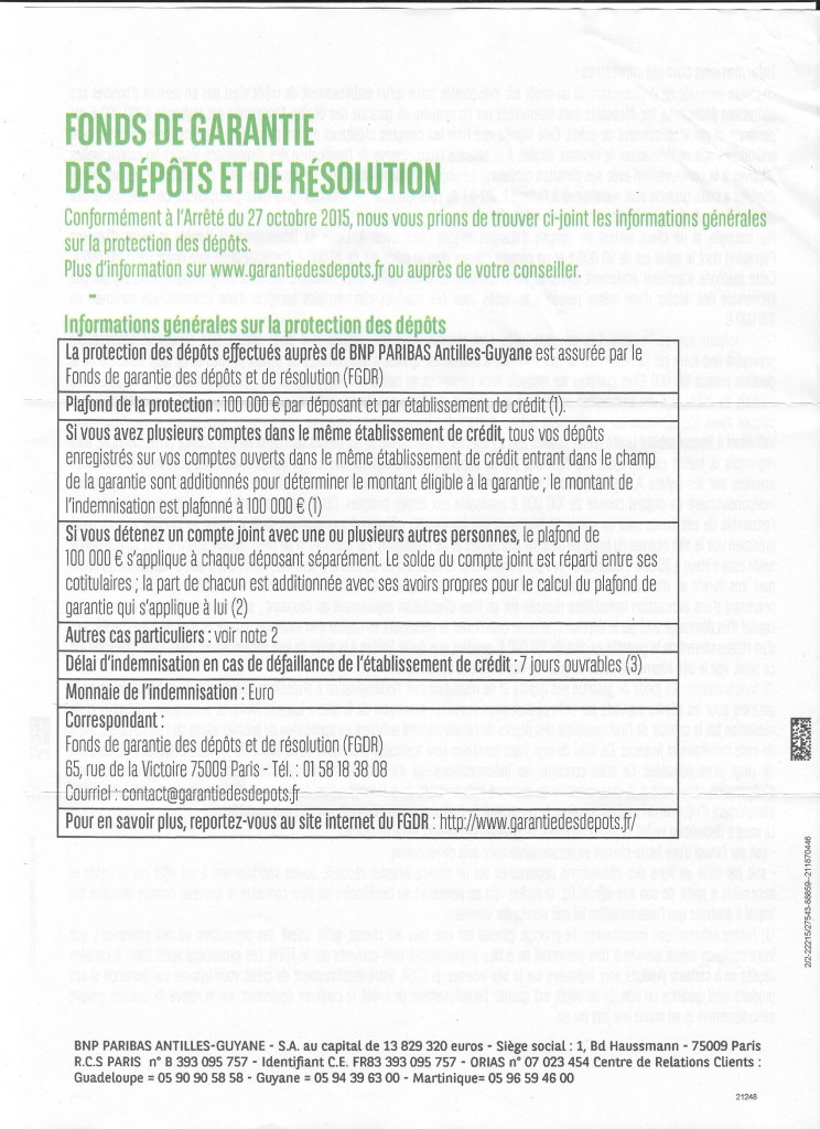La protection des dépôts effectués auprès de BNP PARIBAS Antilles-Guyane est assurée par le Fonds de garantie des dépôts et de résolution (FGDR).