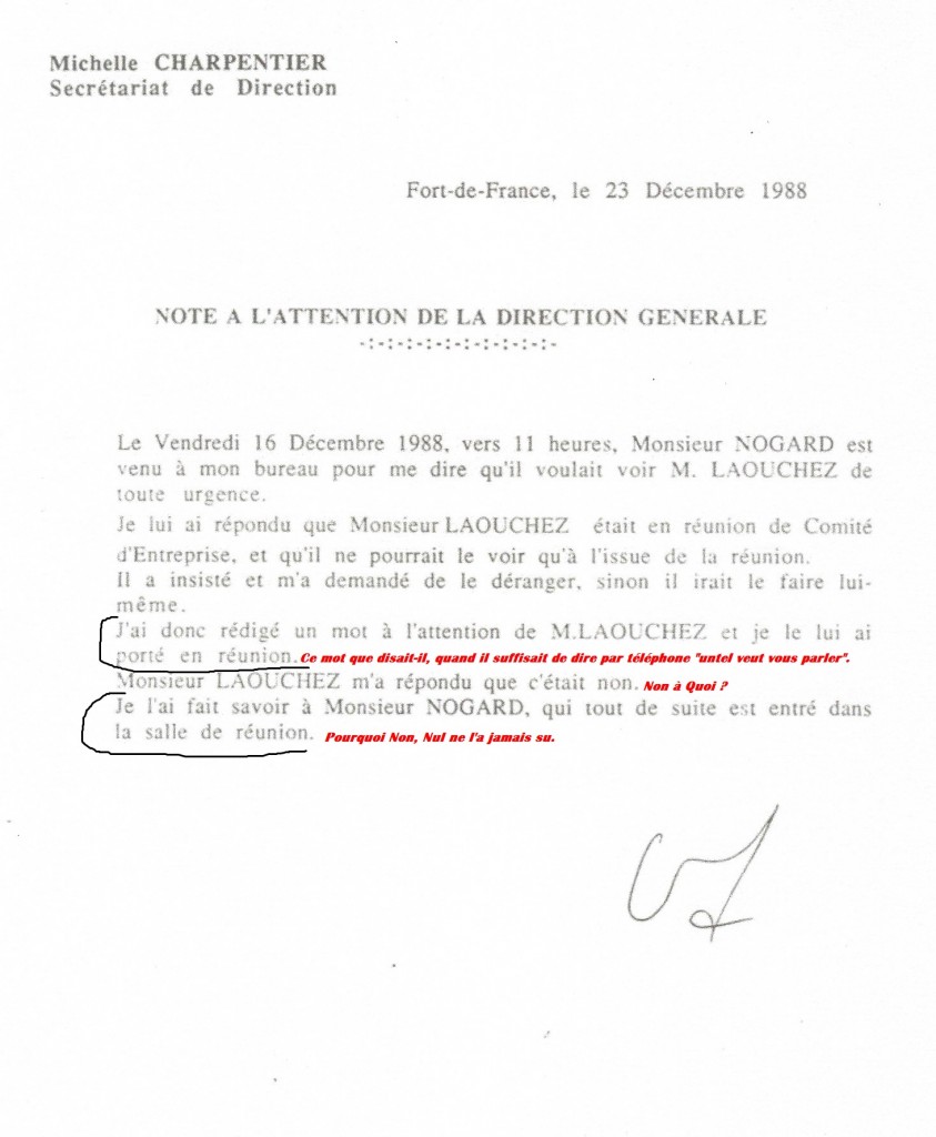 J’ai donc rédigé un mot à l’attention de M.LAOUCHEZ et je le lui ai porté en réunion.    Ce mot que disait-il, quand il suffisait de dire par téléphone « untel veut vous parler ».