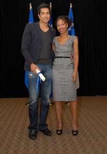 La ministre de l’Immigration et des Communautés culturelles et ministre de la Famille, Mme Yolande James, et M. Smeer Khullar mieux connu sous son nom d’humoriste Sugar Sammy. M. Khullar est finaliste du Prix Jacques-Couture pour la promotion du rapprochement interculturel – catégorie « personnes physiques ».