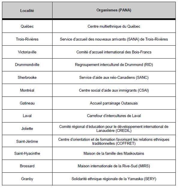 Liste des organismes d’accueil des réfugiés (PANA) |