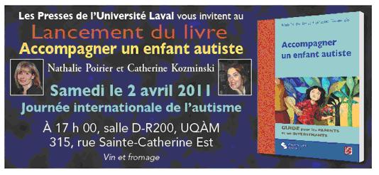 Vous êtes cordialement invité au lancement de l’ouvrage Accompagner un enfant autiste – Guide pour les parents et les intervenants – qui se tiendra le 2 avril prochain à l’occasion de la Journée internationale de l’autisme (voir fichier ci-joint).