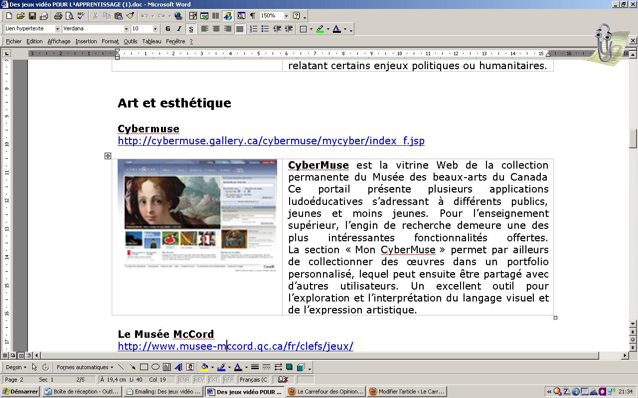 CyberMuse est la vitrine Web de la collection permanente du Musée des beaux-arts du Canada Ce portail présente plusieurs applications ludoéducatives s’adressant à différents publics, jeunes et moins jeunes. Pour l’enseignement supérieur, l’engin de recherche demeure une des plus intéressantes fonctionnalités offertes. |