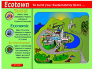 Ecotown est un jeu-questionnaire permettant d’évaluer vos qualités de gestionnaire en matière de développement durable. Le développement y est présenté selon trois axes complémentaires: social, économique et environnemental. Pour chacun d’eux, vous devez choisir quelles actions seraient en principes les plus profitables pour la communauté. Chacune possède des avantages et bénéfices, mais révèle également certaines lacunes et limitations. À la fin du jeu, un graphique présente une courbe de développement en regard des choix que le joueur aura fait. |