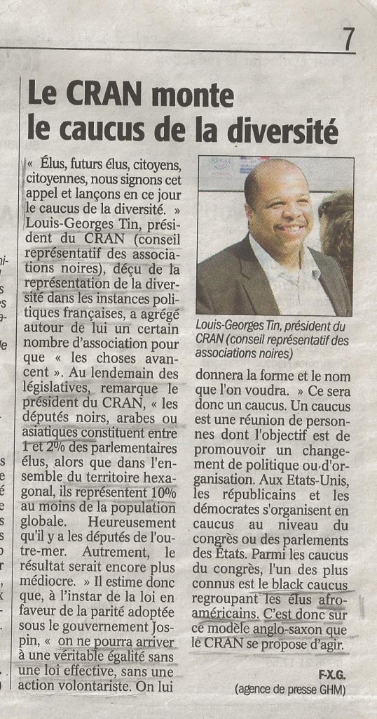 Voilà que le Conseil Représentatif des Associations Noires le C.R.A.N., par la bouche de son Président Louis-Georges TIN, nous apprend la mise sur pied, par ses soins d’un Comité d’Organisation Politique, à l’effet d’obtenir la Promulgation d’une Loi instituant la Représentation Parlementaire Française, au Prorata, par Ethnie, du nombre de Français.