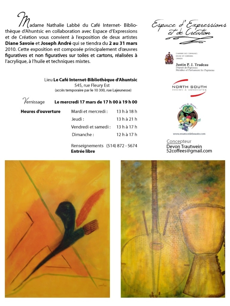 Joseph André expose, avec une autre artiste, Mme Diane Savoie, au café internet de la Bibliothèque d’Ahuntsic, du 2 au 31 mars 2010. Vernissage, mercredi17 mars à 17 h 00. Une exposition composée, tant d’œuvres figuratives que non figuratives, œuvres réalisées sur toiles et cartons, à l’acrylique, à l’huile et avec des techniques mixtes. Le lieu est accessible, du mardi au dimanche, de 13 à 17 h, exceptés les mardis et les mercredis jusqu’à 18 h et le dimanche à partir de 12 h 00.